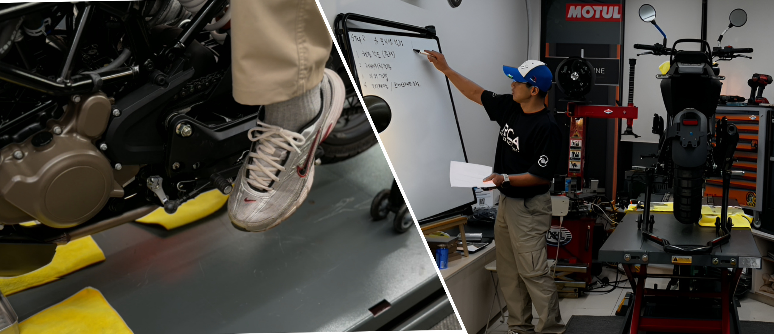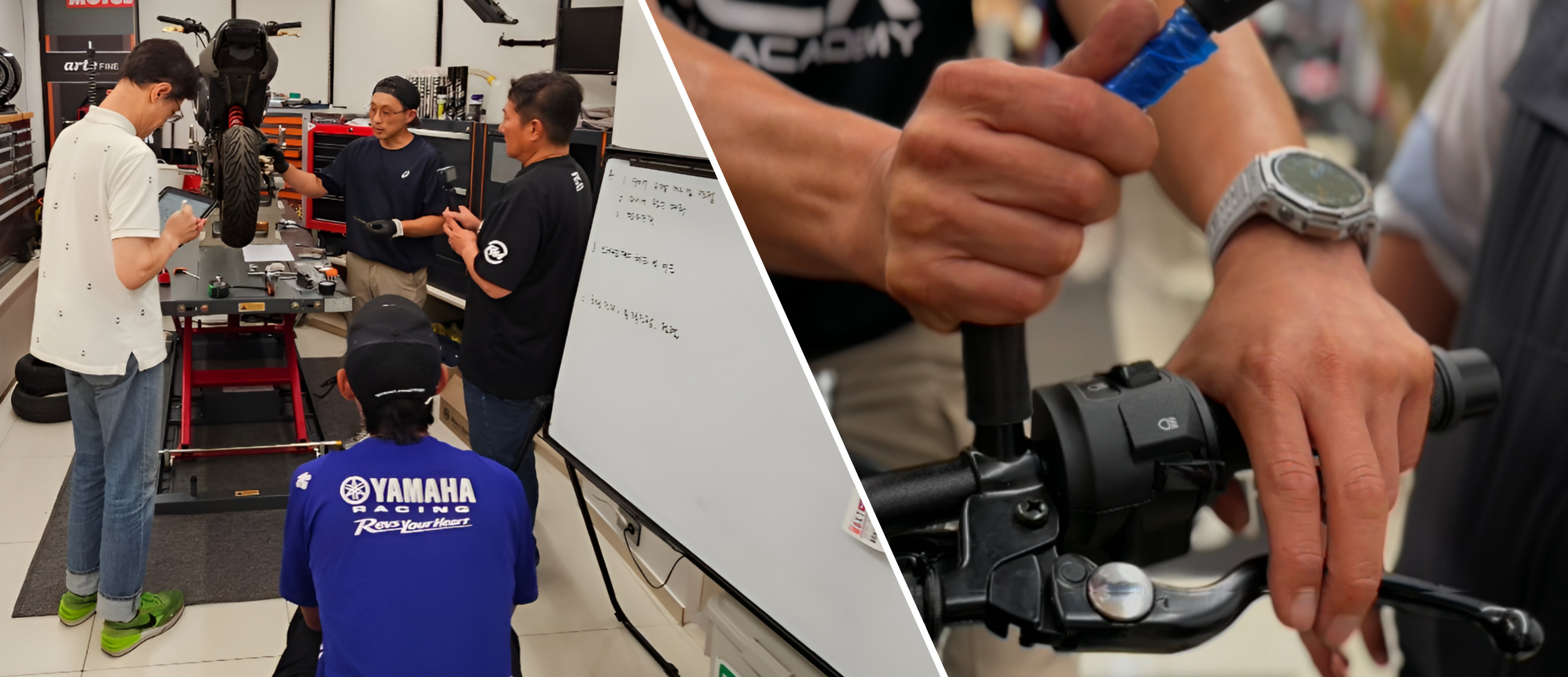 - 내용 : 내 몸에 맞는 바이크 세팅(핸들, 레버, 미러, 기어&브레이크 페달 조정 및 레버 교체 실습)과 중고차량 현장 점검법, (서류&프레임&소모품&전기계통&타이어&브레이크 등 구매 전 필수 체크리스트) 등