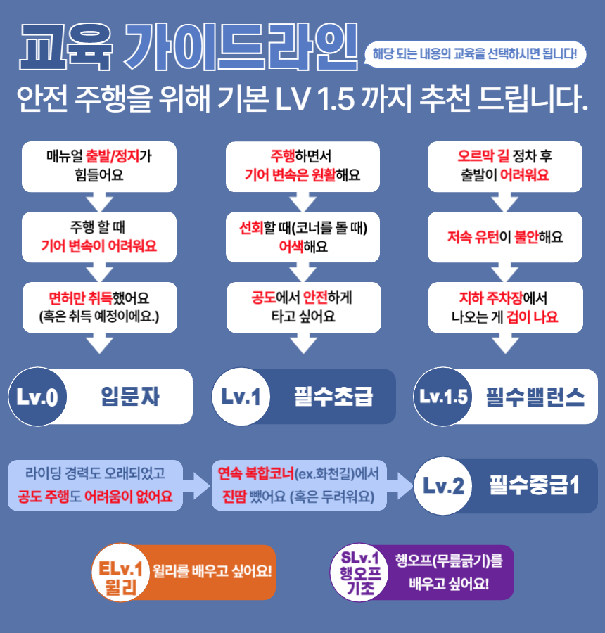 - 교육 : 저속 밸런스 주행, 유턴(3가지 방식) 심화, 오르막 정지/출발, 리어 브레이크 사용, 반클러치 숙달, 지하주차장, 좁은도로, 경사로 안정적 통행 숙달.