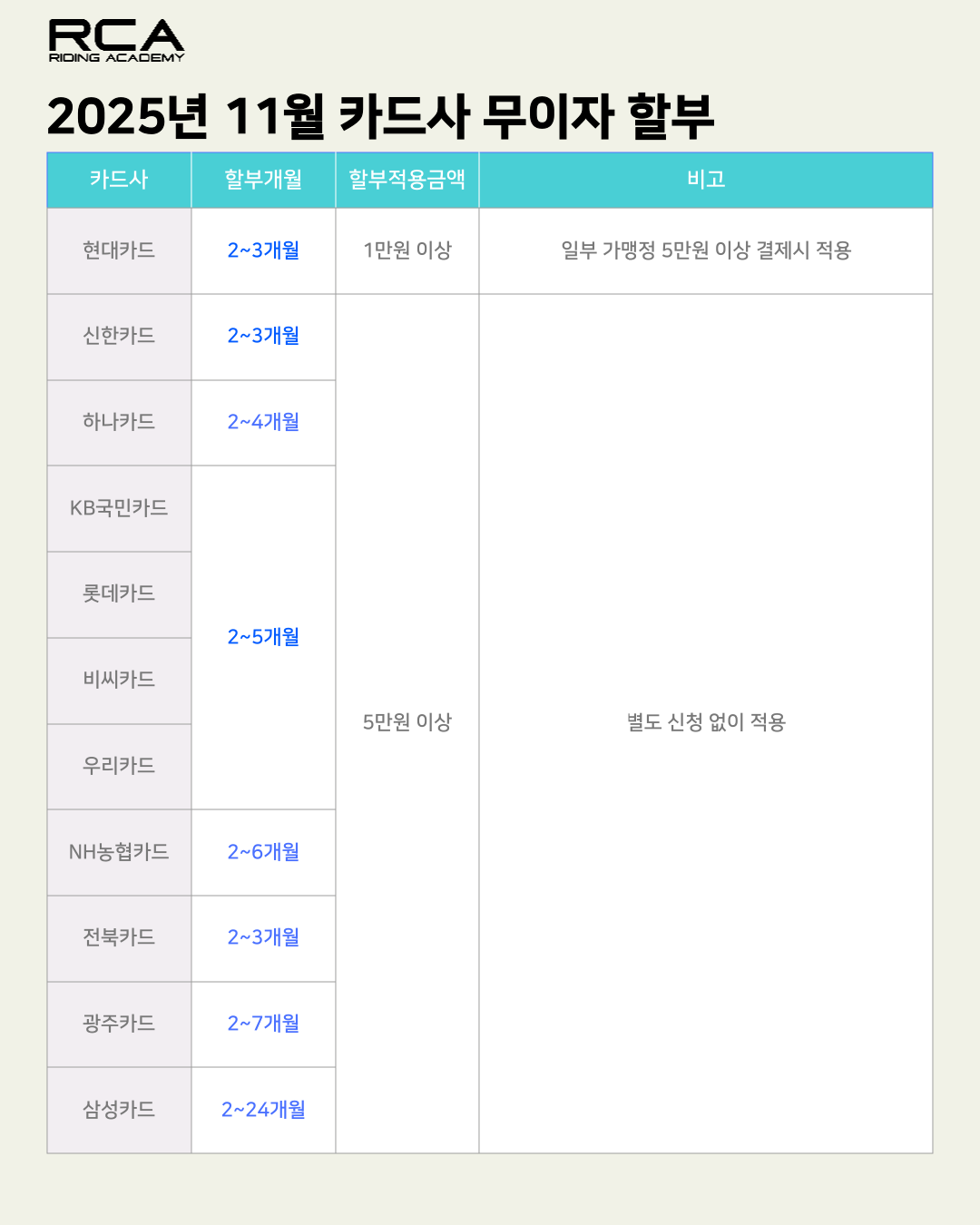 [RCA] 레인조아카데미 홈페이지 11월 무이자 할부 카드사 안내입니다!