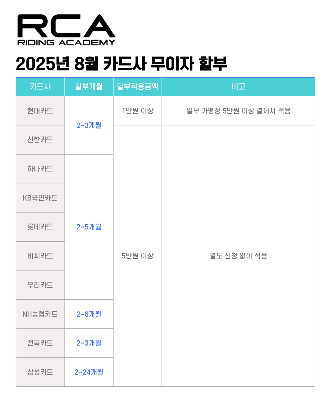 [RCA] 레인조아카데미 홈페이지 8월 무이자 할부 카드사 안내입니다!